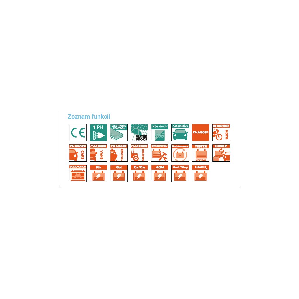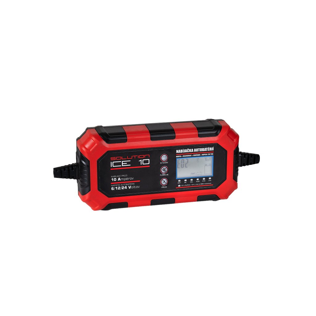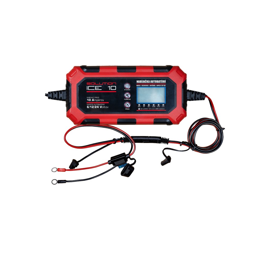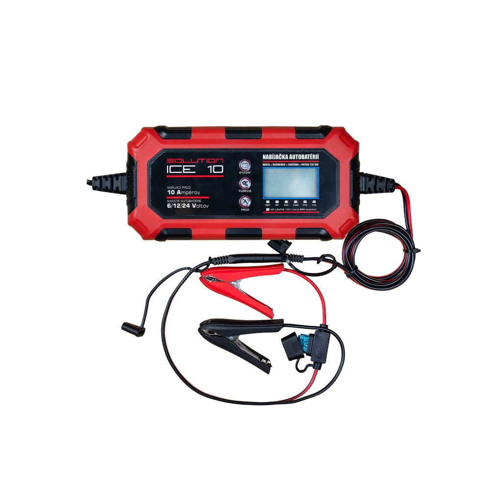 Inteligentná nabíjačka pre 6 V, 12 V a 24 V akumulátory s nabíjacím prúdom až 10 A. Podporuje olovené WET, MF, CAL, EFB, AGM/GEL aj 12 V Li-ion s BMS a LiFePO4 (4-článkové). Riadenie mikroprocesorom, 9-krokový automatický algoritmus, LCD displej a IP65 krytie pre bezpečnú prevádzku v dielni aj garáži.